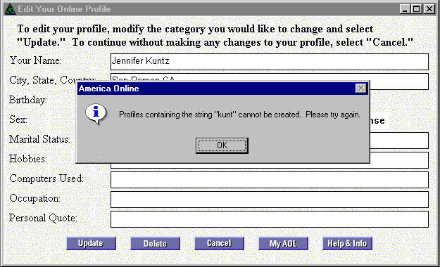 Now AOL's roving robots have claimed another class of victim. Douglas Kuntz claims that 73 AOL users share his surname -- and will be unable to enter it into their member profiles.